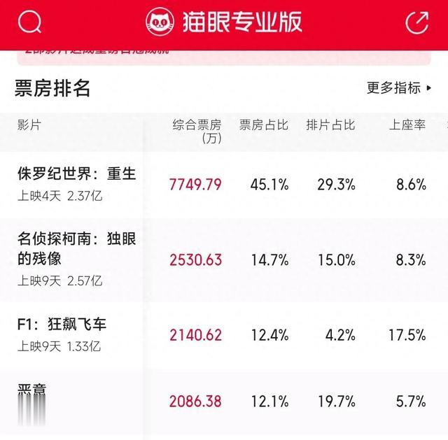2025年7月5日上映的电影《恶意》第一天就出现票房倒挂了,19%的排片占比仅拿到了12%的票房。